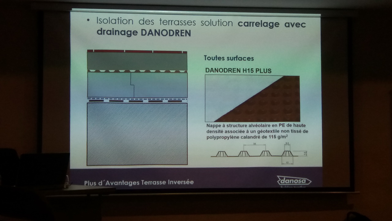Il a abordé aussi la question du choix entre plasticité et élasticité pour déterminer la solution d’étanchéité adéquat a nos besoins. Et enfin il a parlé des différentes solutions de mise en œuvre de l’étanchéité : comme la toiture normale, où l’étanchéité est posée par dessus une isolation elle même par dessus un pare vapeur sur le support. ou l’étanchéité inversée ou on pose d’abord l’étanchéité avant d’ajouter une isolation.